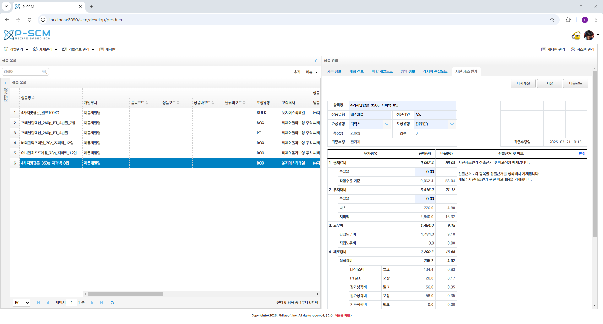 다양한 원료를 공정별로 배합하고 이 결과를 토대로 레시피를 만든 후 식품의 패키지 및 상품정보를 빠르게 생성하고 사전 제조 원가를 예측할 수 있습니다.